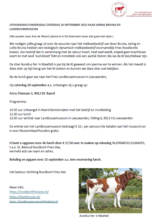 Het bestuur van Stichting Roodbont Friesvee nodigt jullie graag uit voor de excursie naar het melkveebedrijf van Boer Brunia. Met aansluitend een bezoek aan het Fries Landbouwmuseum in Leeuwarden.